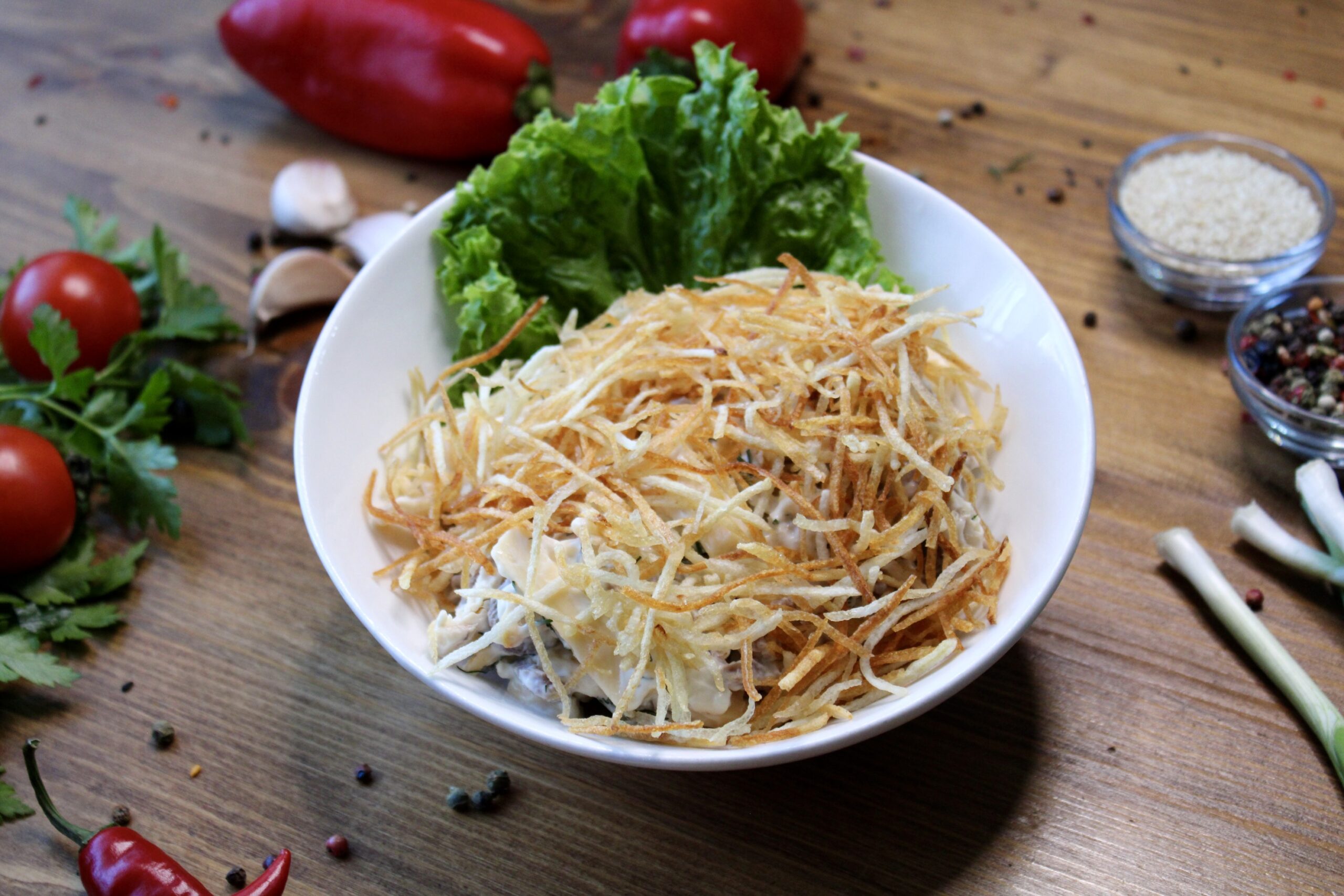 язык, сыр. курица, чеснок, укроп, майонез, картофель пай